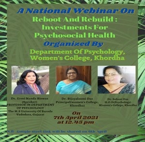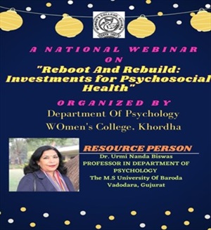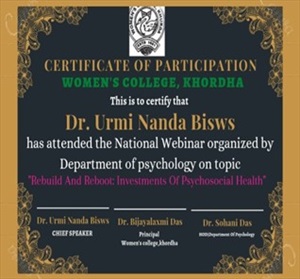 The Department of Psychology was founded in the then Women's College Khordha by MRS.Tanushree Biswal in 1981 with the creation of intermediate in Arts classes. Then it is converted into +2 Arts college during the session 1983-84. After that the college stepped into Bachelor Degree in psychology during the session 1997-88. Honours in psychology opened in 2004-05. Currently the Department runs UG (Honours& Elective) Programmes.