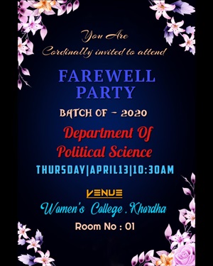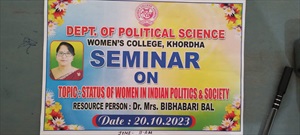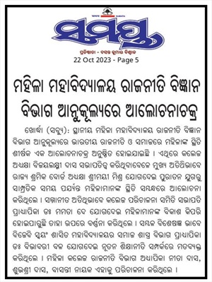 The Department of Political Science was founded in 1981. Dr Mrs Biswamohini Mangaraj was the first faculty member of the Dept. Political Science was taught as Pass and Elective subject in graduation level and as Optional subject at intermediate level. Honours teaching of the subject started in 2018 with 16 seats.