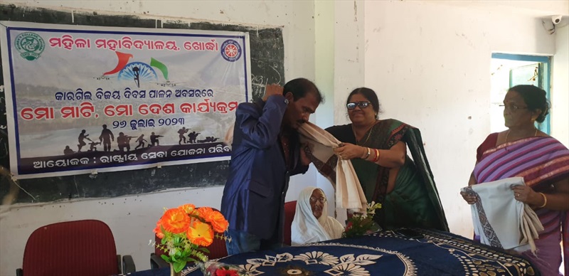 MERI MATA MERA DESH programme was organised by the NSS unit of Women's College, Khordha on the occasion of Kargil Vijay Diwas. Freedom fighter Laxmi Dibya and BSF jawan Srijukta Janak Mangaraj graced the event and were felicitated by the Principal.